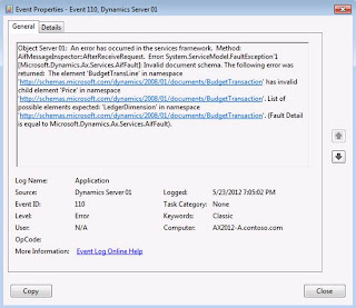 If you take a look at error message logged in Event Viewer you will see the following error message "Object Server 01: An error has occurred in the services framework. Method: AifMessageInspector::AfterReceiveRequest. Error: System.ServiceModel.FaultException`1[Microsoft.Dynamics.Ax.Services.AifFault]: Invalid document schema. The following error was returned: The element 'BudgetTransLine' in namespace 'http://schemas.microsoft.com/dynamics/2008/01/documents/BudgetTransaction' has invalid child element 'Price' in namespace 'http://schemas.microsoft.com/dynamics/2008/01/documents/BudgetTransaction'. List of possible elements expected: 'LedgerDimension' in namespace 'http://schemas.microsoft.com/dynamics/2008/01/documents/BudgetTransaction'. (Fault Detail is equal to Microsoft.Dynamics.Ax.Services.AifFault)" which describes the real issue with document schema.
